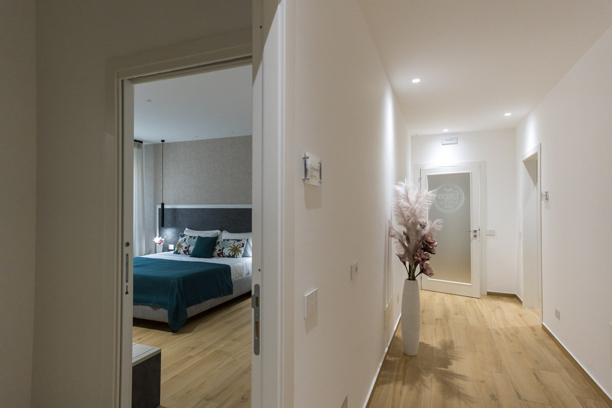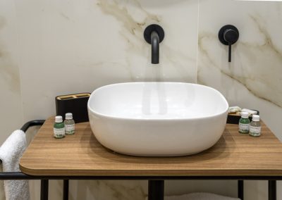 Il bagno è dotato di uno spazioso box doccia, uno scalda salviette per godere di asciugamani caldi, bidet, specchio ed un kit omaggio in plastica riciclabile.