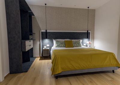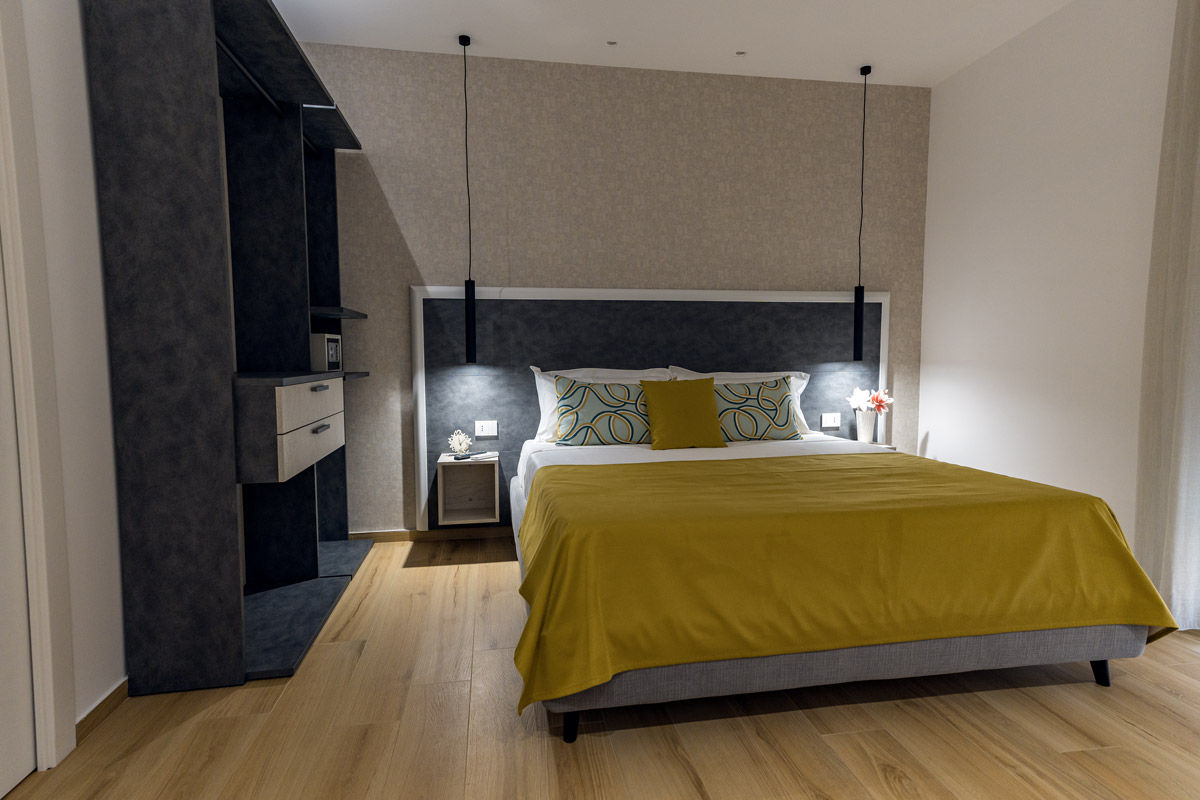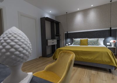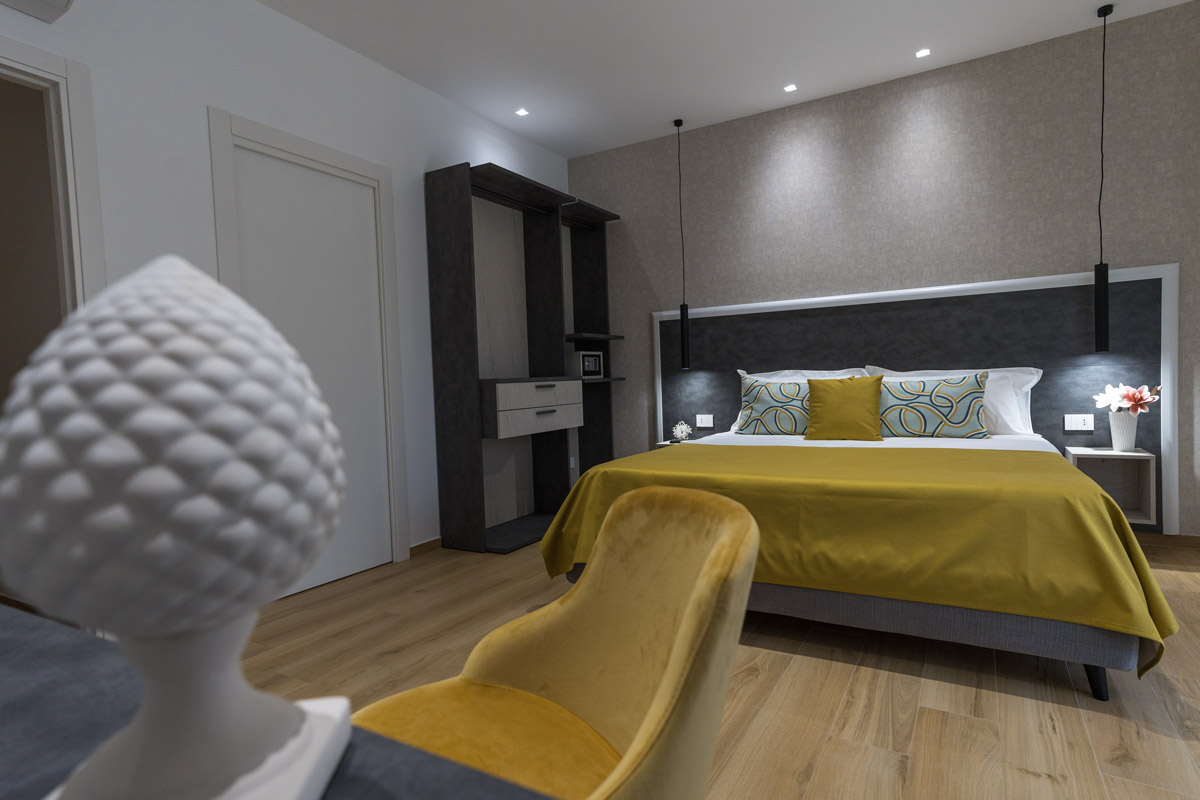 Camera deluxe matrimoniale di 20 m², insonorizzata e climatizzata. Pavimentata in parquet, offre una serie di comfort e uno spazioso bagno privato. Arredamento ricercato ma funzionale, caratterizzato da tonalità di giallo.