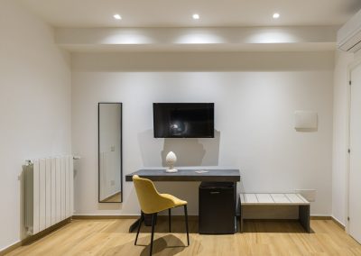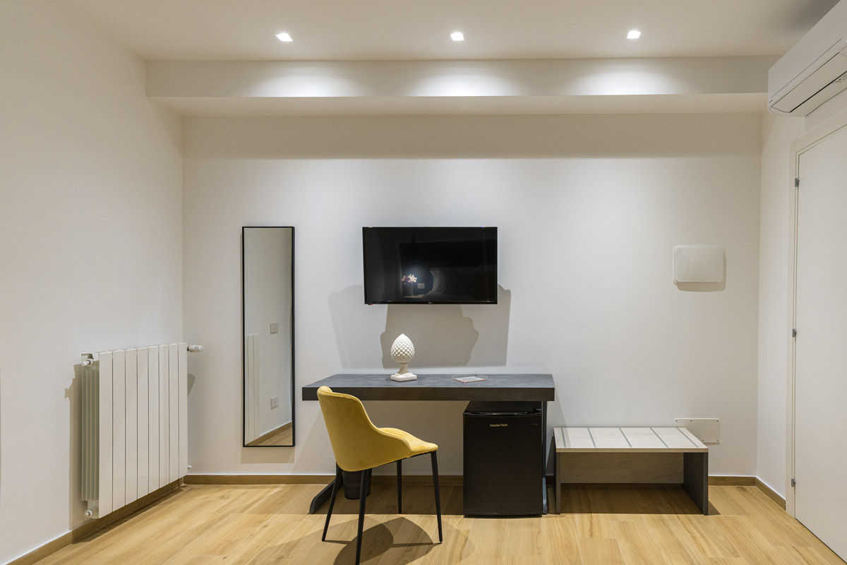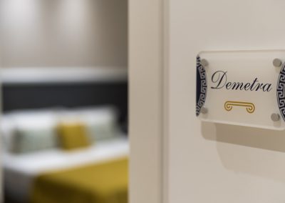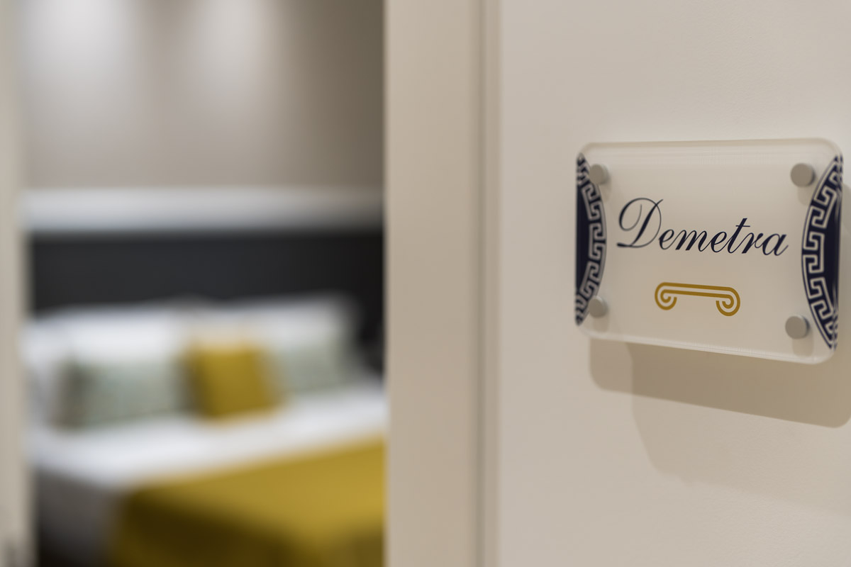 Demetra è una camera deluxe matrimoniale di 20 m², insonorizzata e climatizzata. La camera, dotata di aria condizionata e riscaldamento, è pavimentata in parquet. Le dimensioni del letto sono extra lunghe, oltre i 2 metri. Sono presenti una varietà di comfort tra cui una scrivania, una TV a schermo piatto, un frigorifero, una cassaforte, wifi gratuito, canali via cavo, asciugamani, armadio, stand appendiabiti ,zanzariera, prese elettriche posizionate vicino al letto e culla gratuita per bambini da 0 a 3 anni disponibile su richiesta. È vietato fumare.