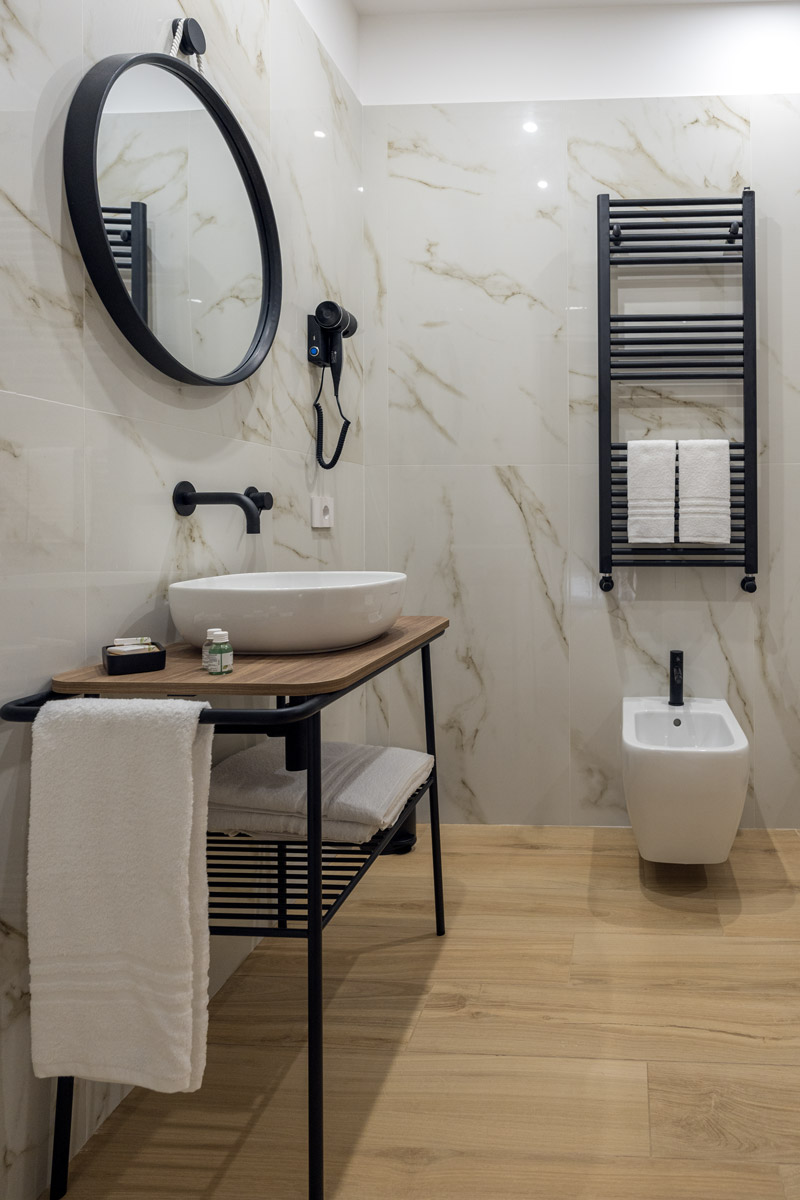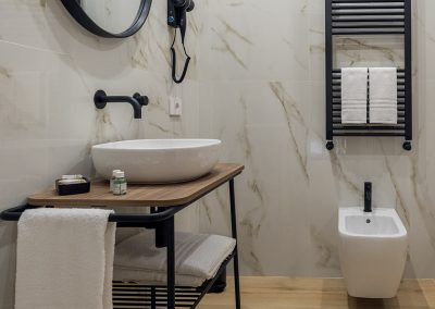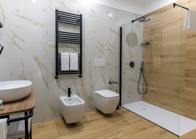 Il bagno è dotato di uno spazioso box doccia, uno scalda salviette per godere di asciugamani caldi, bidet, specchio ed un kit omaggio in plastica riciclabile.