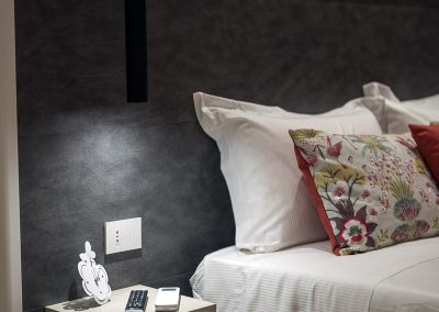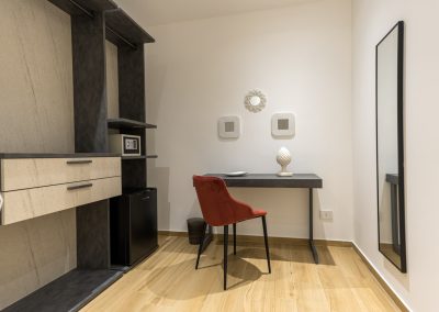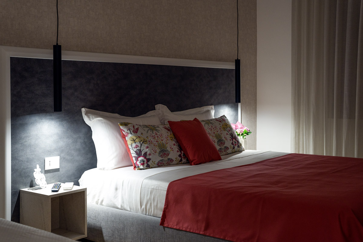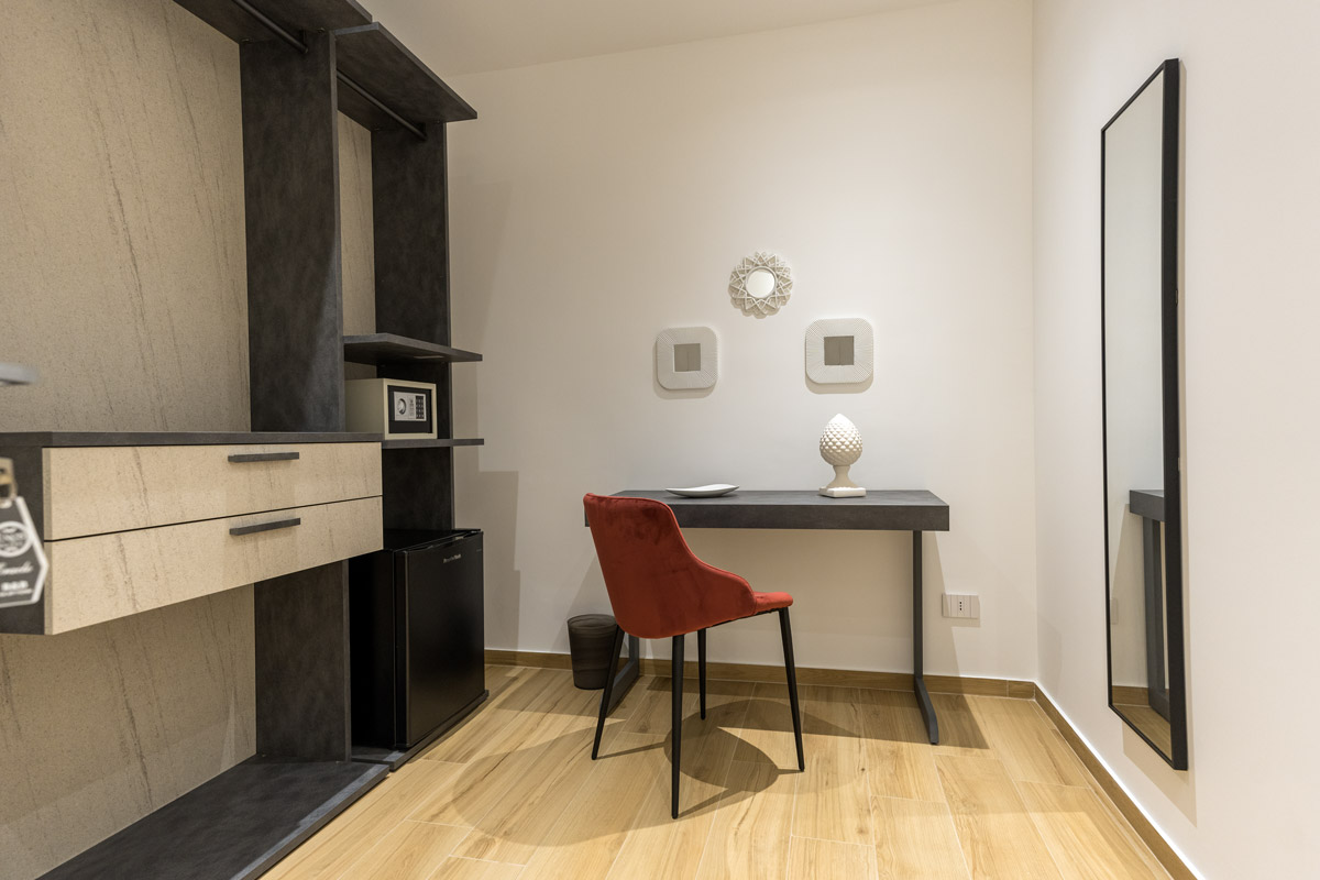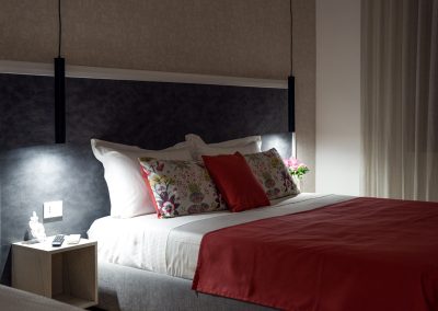 Camera tripla deluxe di 25 m², insonorizzata e climatizzata. Pavimentata in parquet, offre una serie di comfort e uno spazioso bagno privato. Arredamento ricercato ma funzionale, caratterizzato da tonalità di rosso.