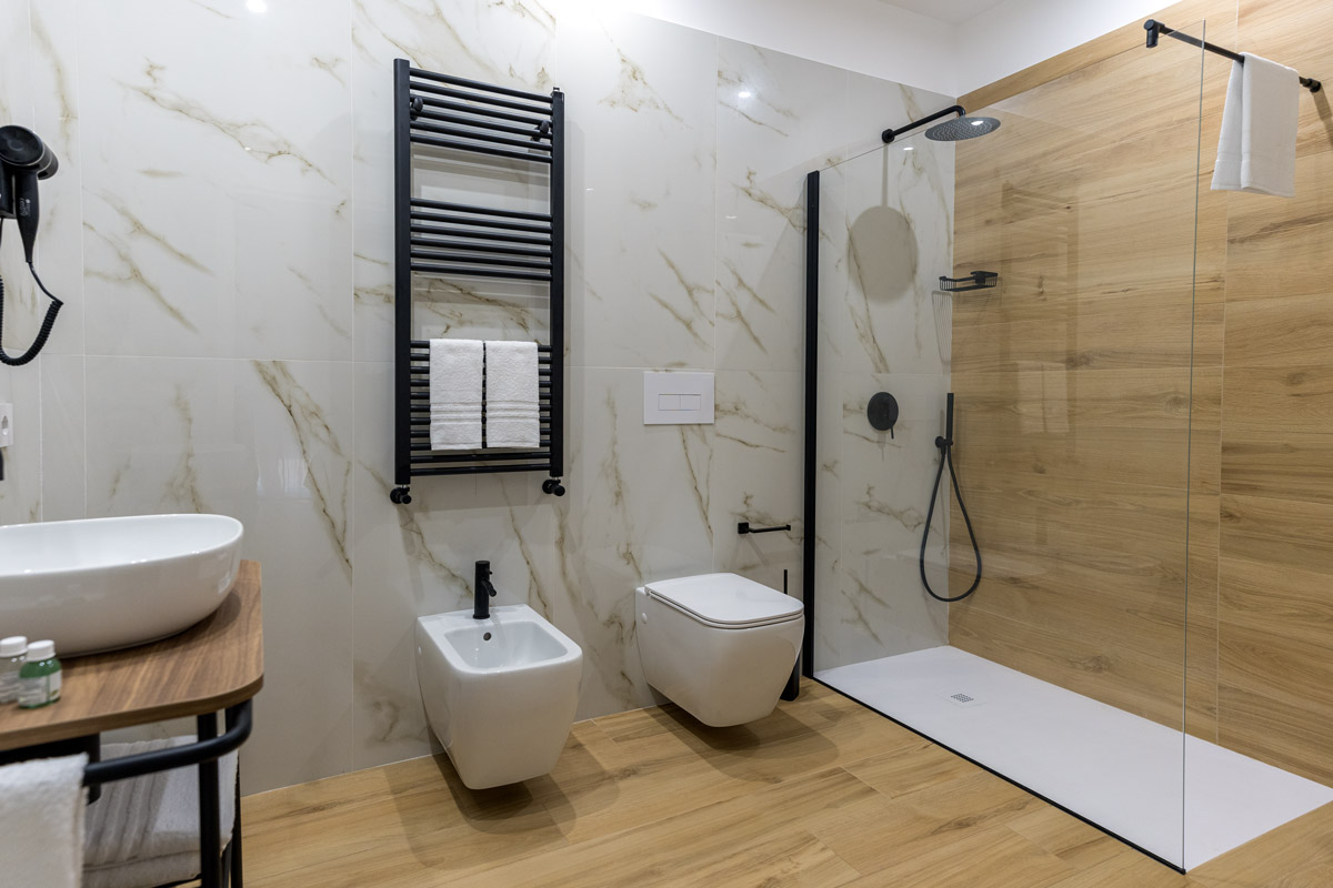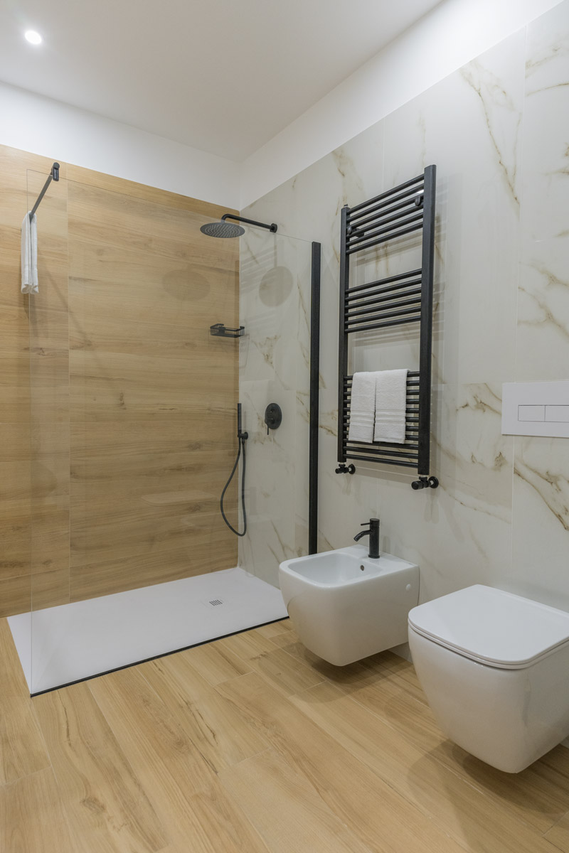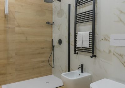 Il bagno è dotato di uno spazioso box doccia, uno scalda salviette per godere di asciugamani caldi, bidet, specchio ed un kit omaggio in plastica riciclabile.